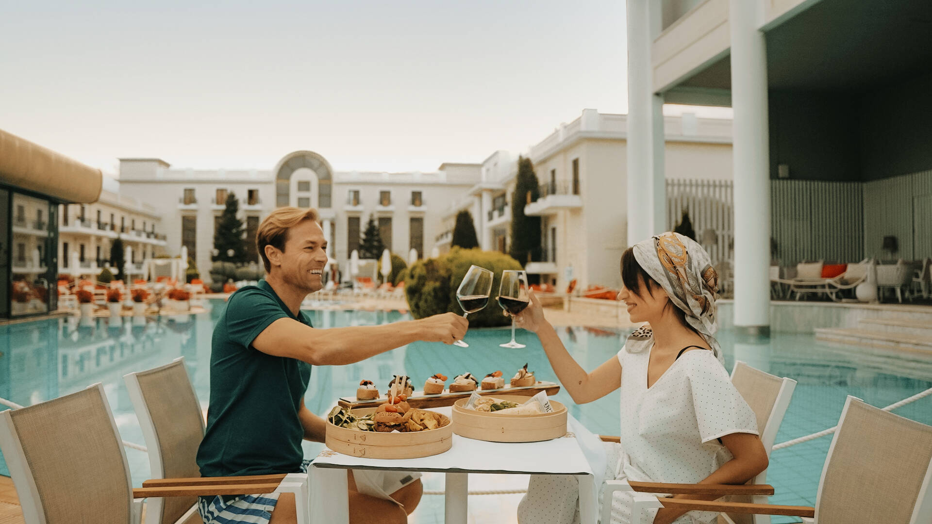 Άνετος καφές με lounge μουσική, δροσιστικά ροφήματα, ελαφριά σνακ δίπλα στην πισίνα.
